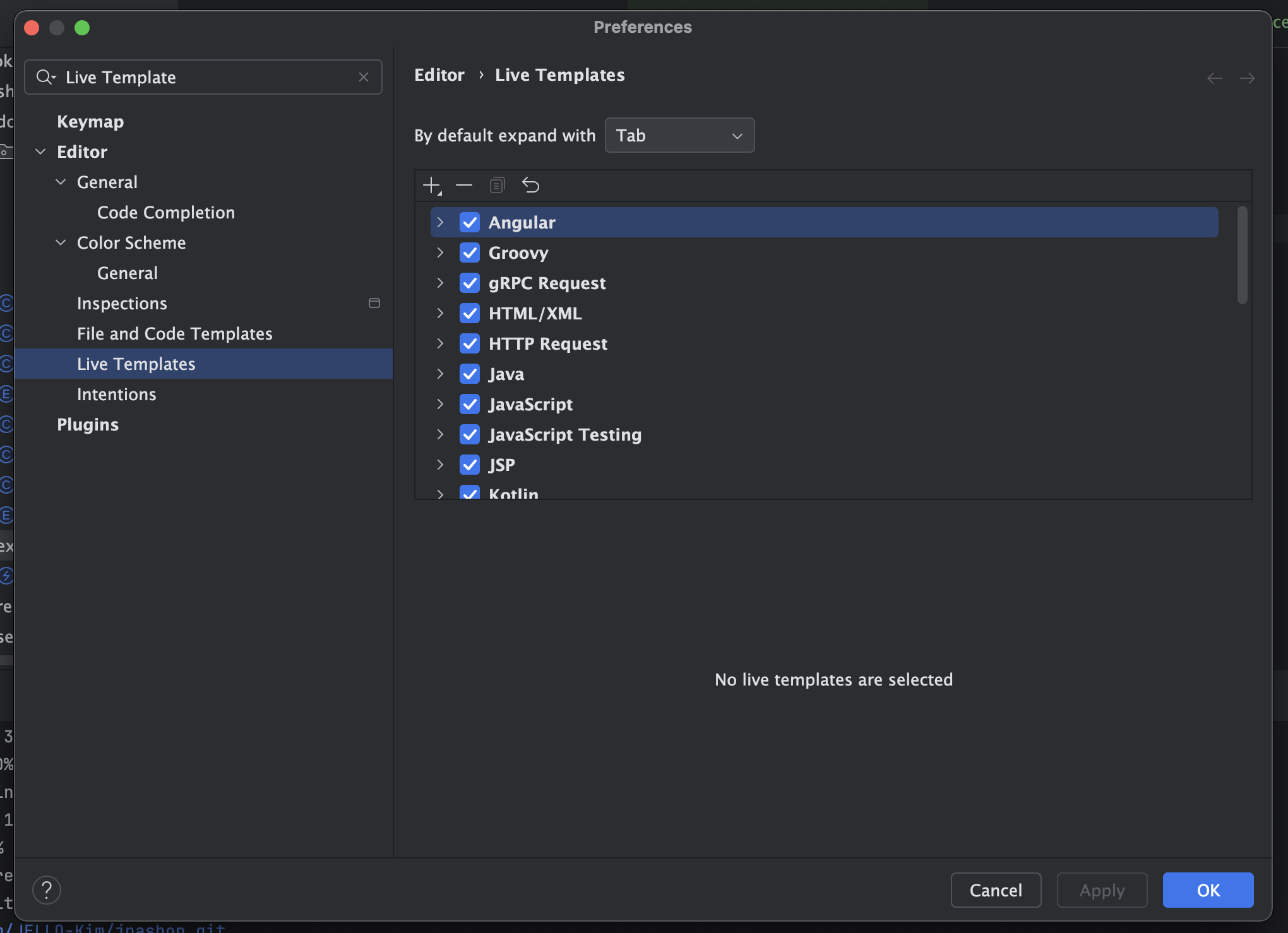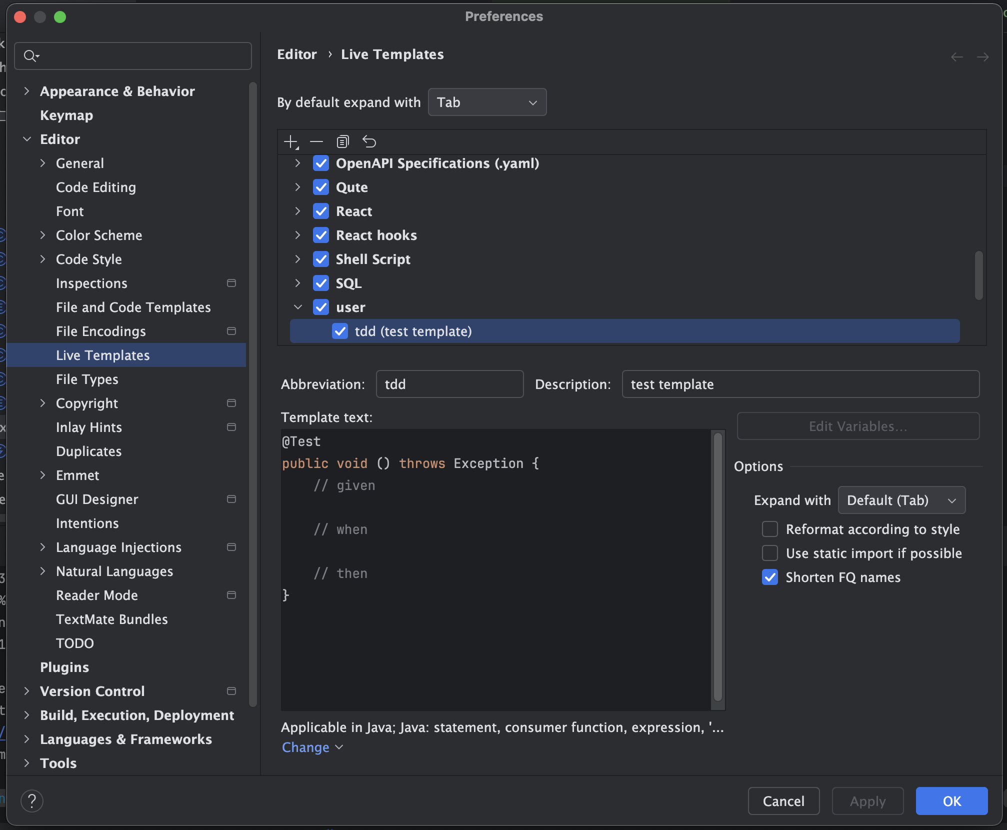 김영한님의 스프링 강의를 들으면서 테스트코드 템플릿을 자주 접하게 되었는데 이 템플릿을 나도 등록하여 사용하면 실무에서도 유용하게 사용하게 될것 같아서 등록~!