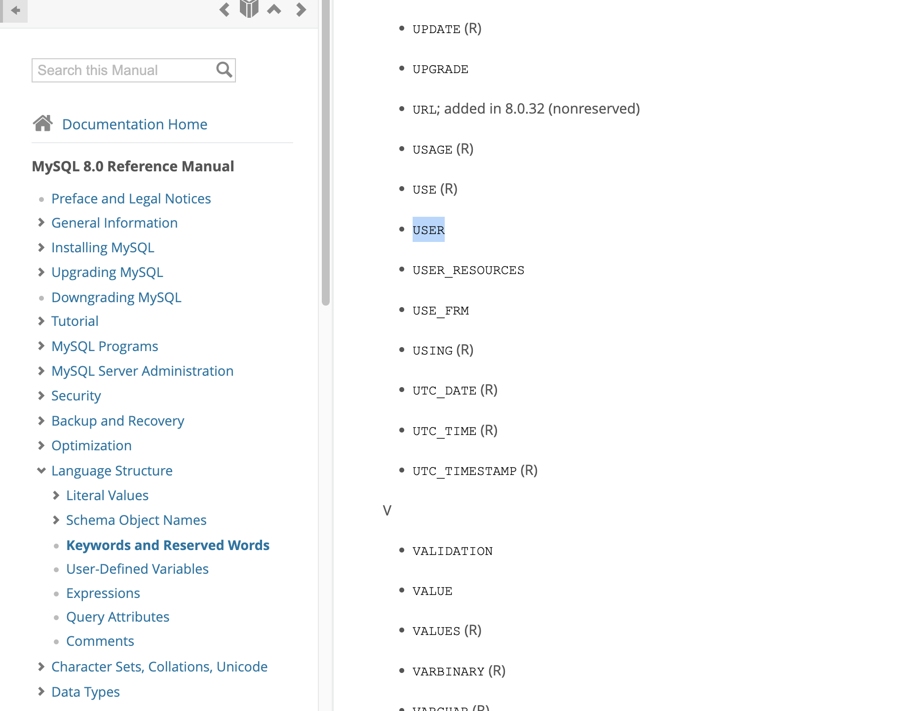 https://dev.mysql.com/doc/refman/8.0/en/keywords.html#keywords-in-current-series