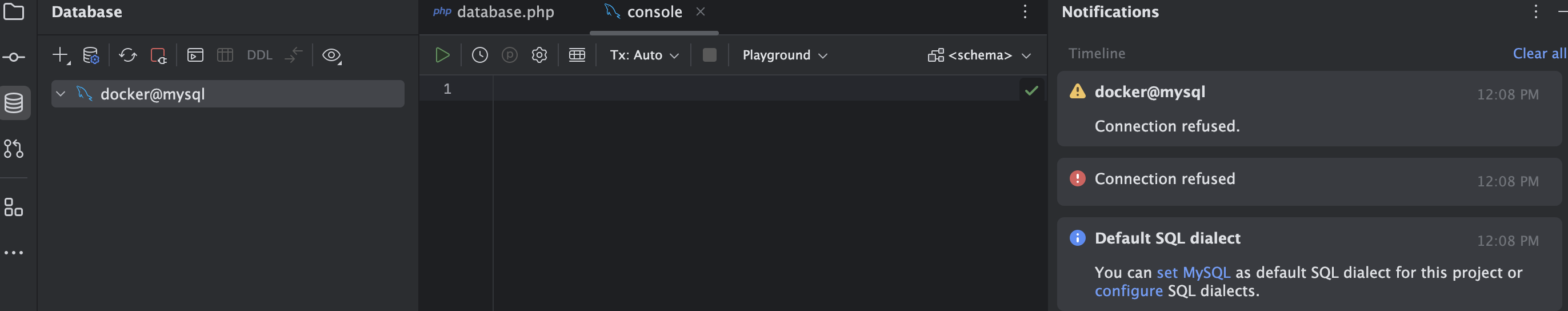 아까도 말했듯이 docker가 실행중이 아니라면 DB 연결이 실패한다!!! 아래와 같은 에러메세지가 뜨고 db 안은 텅 비어있다.