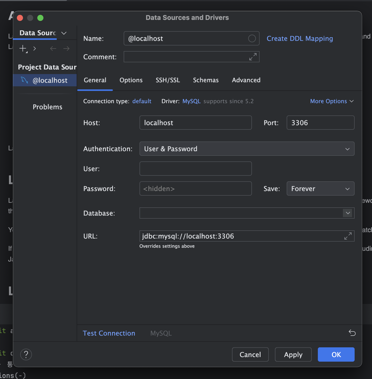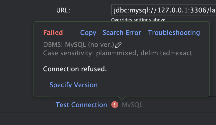 참고로 정보를 입력한 뒤 아래의 `Test Connection` 을 누르면 Failed 뜬다.. 그치만 연결 된다 ㅋㅋㅋ