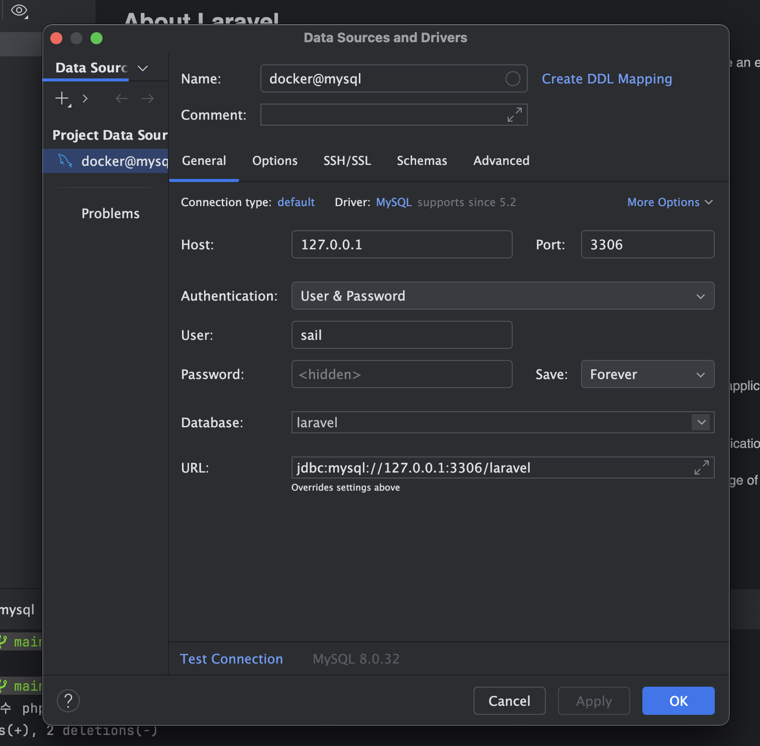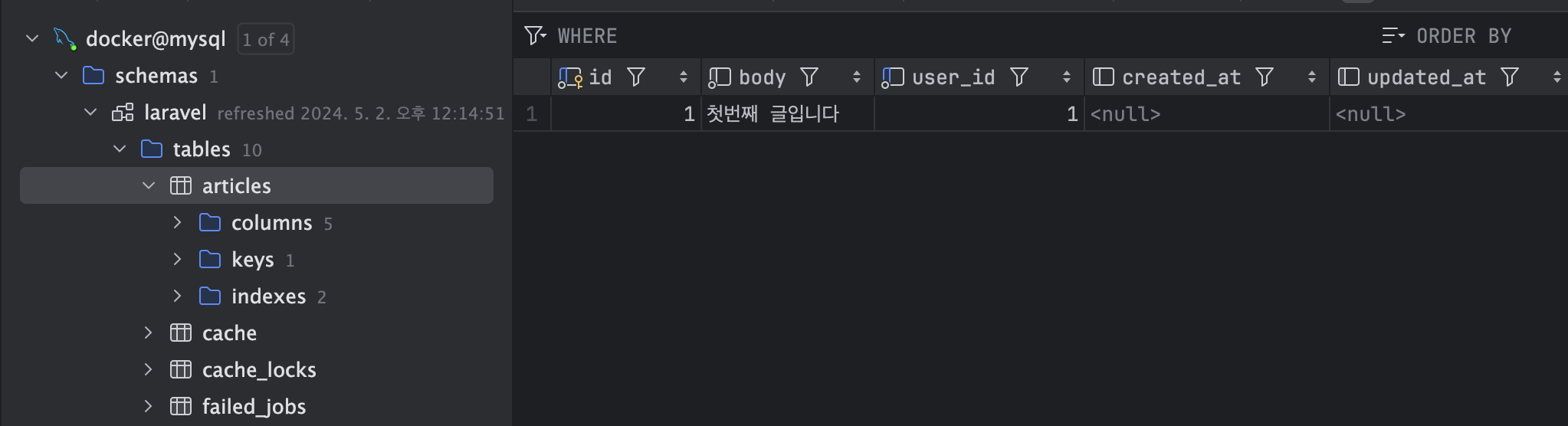 참고로 처음에 db를 연결할때 database 를 `Laravel` 로 하였기 때문에 해당 db가 연결된 것이다.
