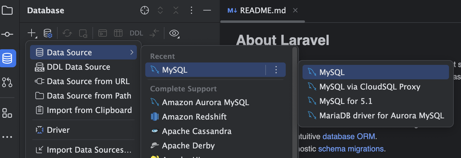 나의 프로젝트는 mysql을 사용중이다! 따라서 `Data Source > MySQL` 을 선택해 준다.