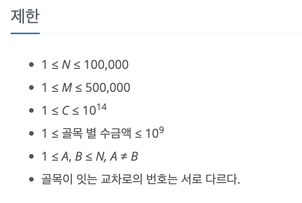당신은 A 번 교차로에서 B 번 교차로까지 C 원을 가지고 가려고 한다. 호석이의 횡포를 보며 짜증은 나지만, 분신술을 이겨낼 방법이 없어서 돈을 내고 가려고 한다. 하지만 이왕 지나갈 거면, 최소한의 수치심을 받고 싶다. 당신이 받는 수치심은 경로 상에서 가장 많이 낸 돈에 비례하기 때문에, 결국 갈 수 있는 다양한 방법들 중에서 최소한의 수치심을 받으려고 한다. 즉, 한 골목에서 내야 하는 최대 요금을 최소화하는 것이다.