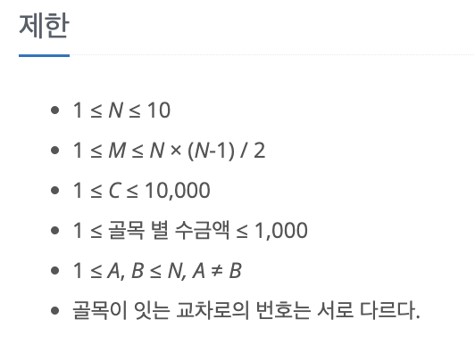 20168번은 N의수가 최대 10까지이다. 따라서 모든 교차로를 확인할 경우 최대 O(n^2)의 복잡도를 가지는데 이는 100이므로 시간초과 범위 내에서 해결이 가능하다.
