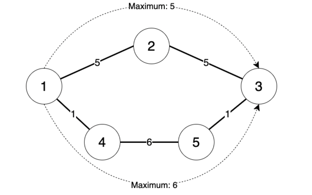예를 들어, 위의 그림과 같이 5개의 교차로와 5개의 골목이 있으며, 당신이 1번 교차로에서 3번 교차로로 가고 싶은 상황이라고 하자. 만약 10원을 들고 출발한다면 2가지 경로로 갈 수 있다. 1번 -> 2번 -> 3번 교차로로 이동하게 되면 총 10원이 필요하고 이 과정에서 최대 수금액을 5원이었고, 1번 -> 4번 -> 5번 -> 3번 교차로로 이동하게 되면 총 8원이 필요하며 최대 수금액은 6원이 된다. 최소한의 수치심을 얻는 경로는 최대 수금액이 5인 경로이다. 하지만 만약 8원밖에 없다면, 전자의 경로는 갈 수 없기 때문에 최대 수금액이 6원인 경로로 가야 하는 것이 최선이다.