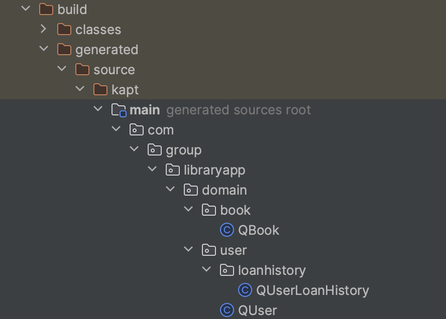 설정 변경후 빌드를 하면 `build > generated > source > kapt > main > .....{프로젝트 루트} ..... > domain` 에 User와 Book이 아닌 QUser QBook 처럼 앞에 Q가 붙은 클래스들이 생성된걸 볼 수 있다.